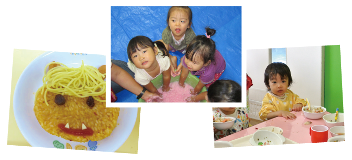 あそびを通して人との関わりを大切にし、おじいちゃん、おばあちゃんや地域の方々と関わり、季節のイベントを楽しみます。そして、子どもたちは兄弟姉妹のように関わりを深め、愛情と信頼感を育みます。ちゃのま縁日や小麦粉のりあそび、ジュース屋さんごっこ、コーナー保育、トンネルやマット、平均台を使った運動遊びなど、保育士が毎日工夫を凝らした“あそび”がちゃのま保育園にはあります。
