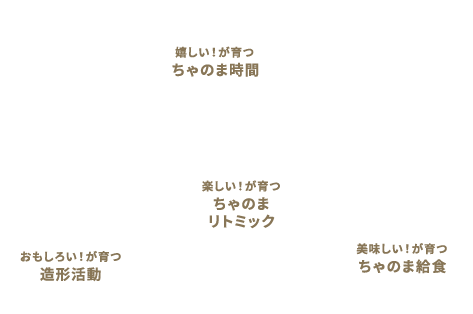 子どもの頃、実家には小さな『茶の間』がありました。茶の間には、おばあちゃんがいつも居て、「いってきます!」には「いってらっしゃい!」、「ただいま!」には「おかえりなさい!」と、応えてくれました。時代は変わっても“保育の根っこ” は変わりません。ちゃのま保育園にも、子ども達を愛する保育士さんが“にこにこ”と出迎えます。そして茶の間のおばあちゃんのように、泣いてる子に寄り添い、悩んでいる子を見守り、愛情たっぷりに子どもたちをまるごと受け止める保育園です。